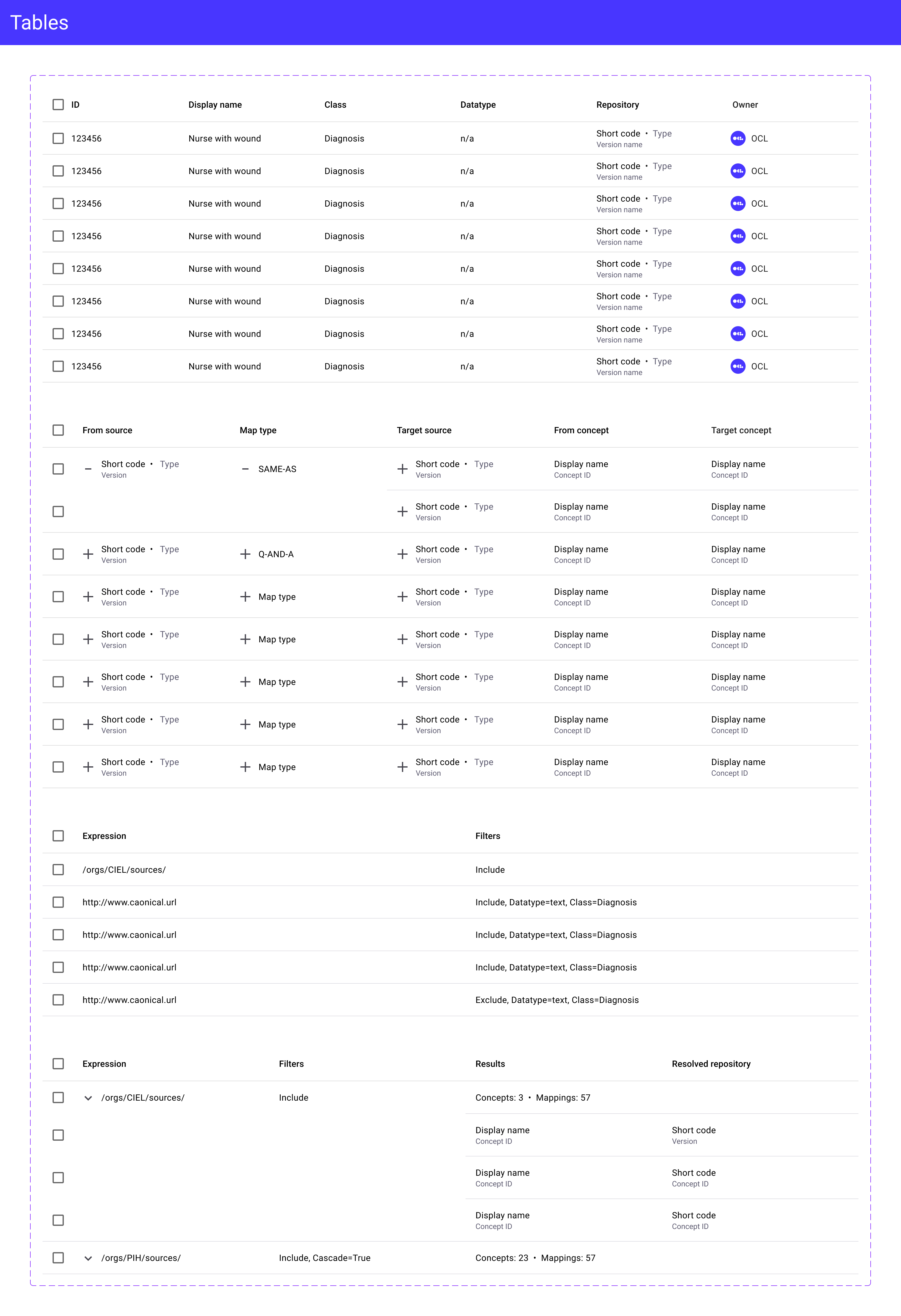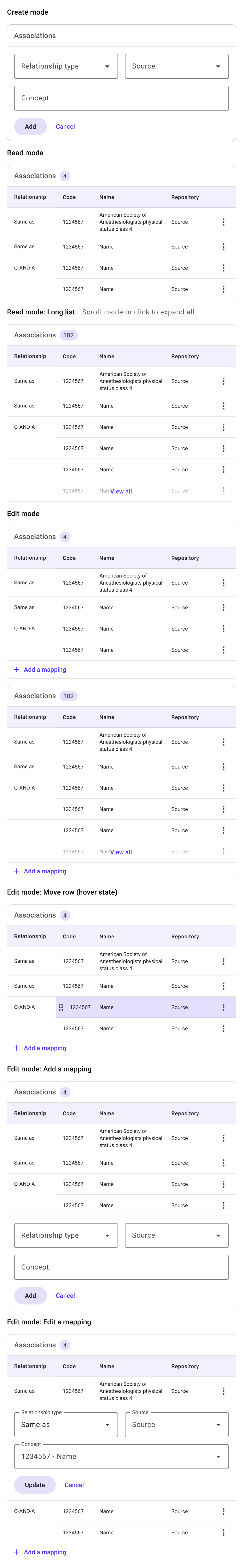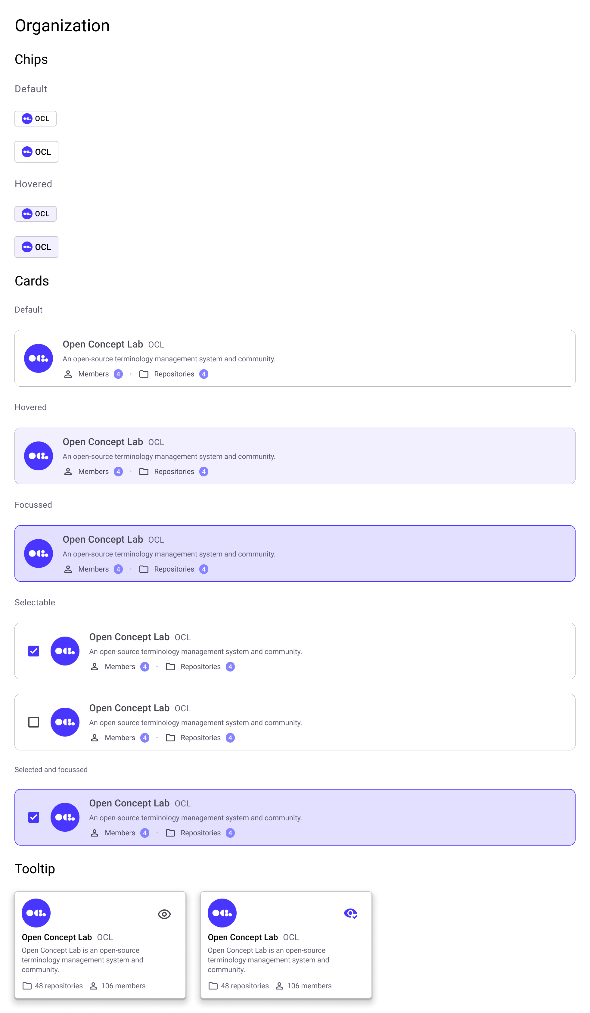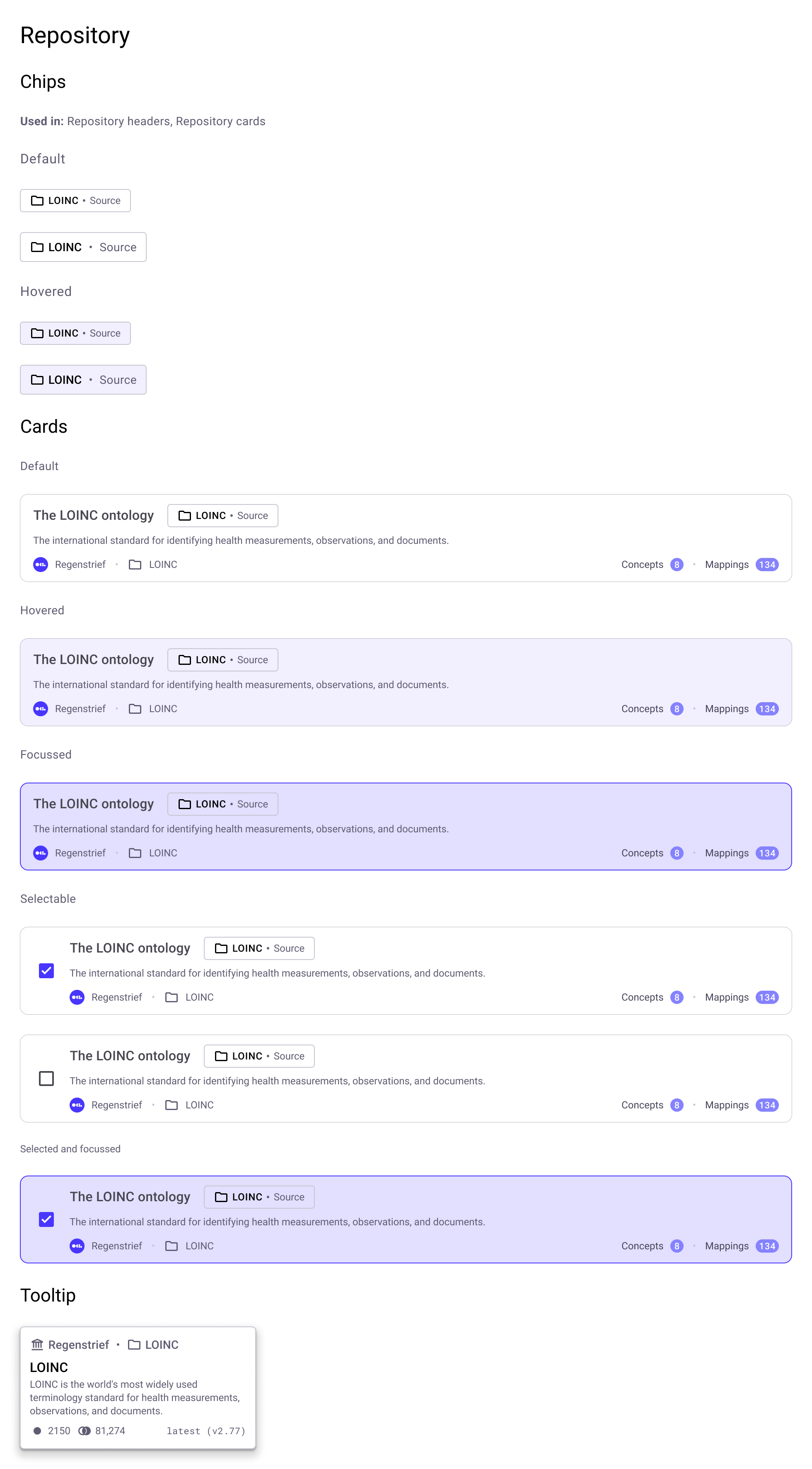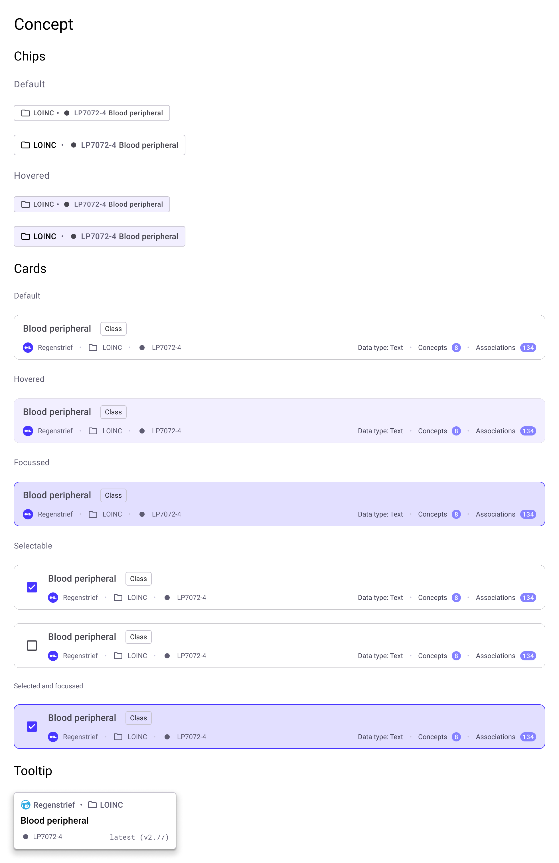 Card designs exist; tooltips and chips aren't implemented for concept/mapping/reference/expansion yet. Associations are present but not hierarchical.