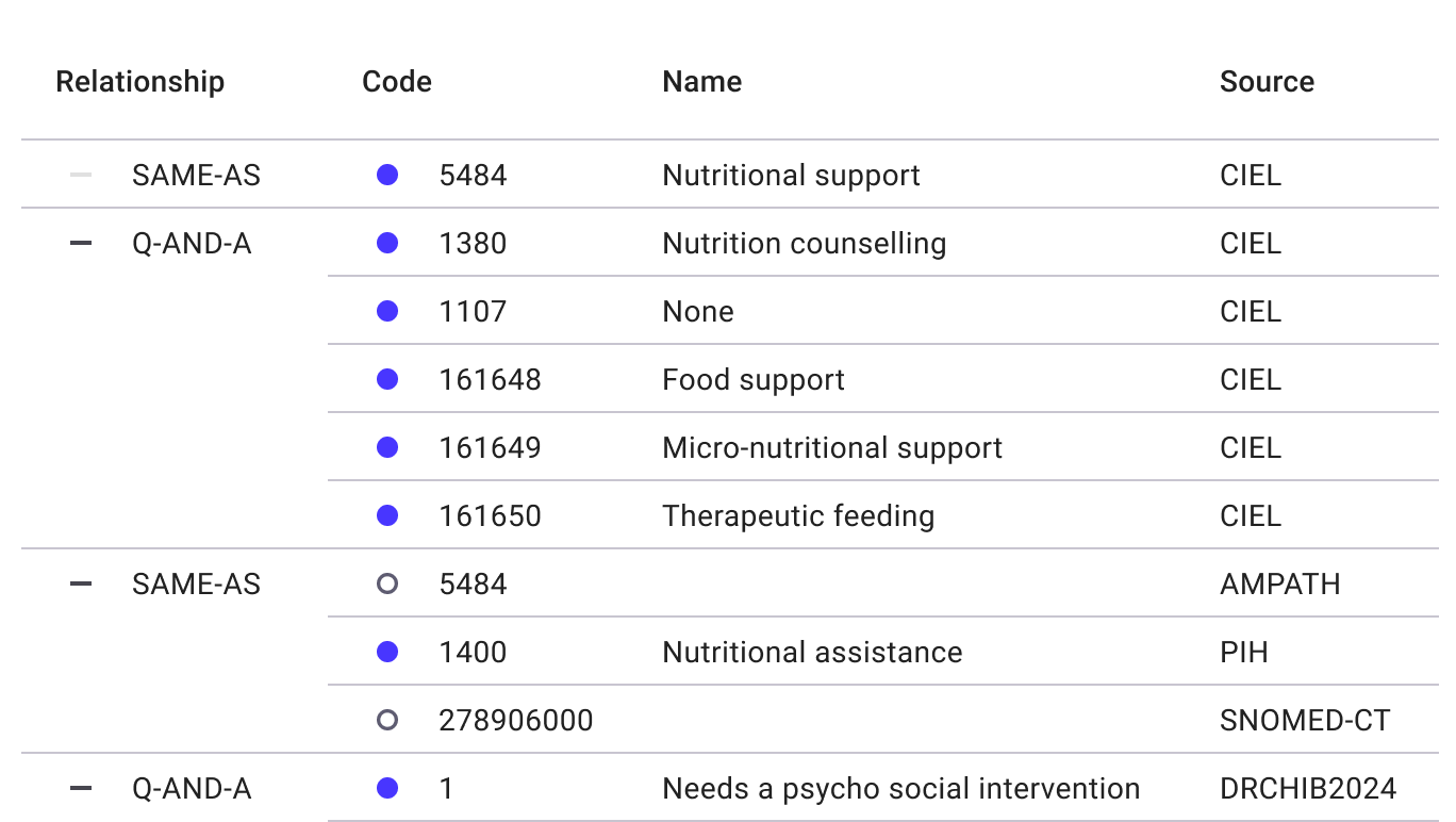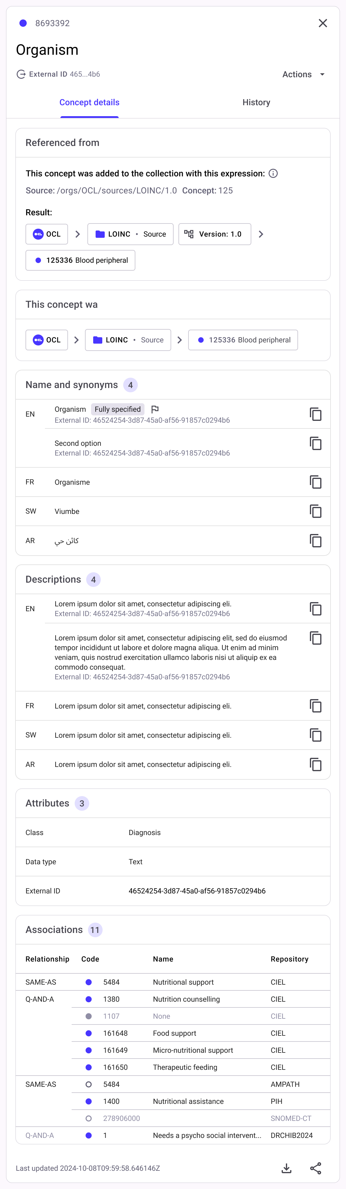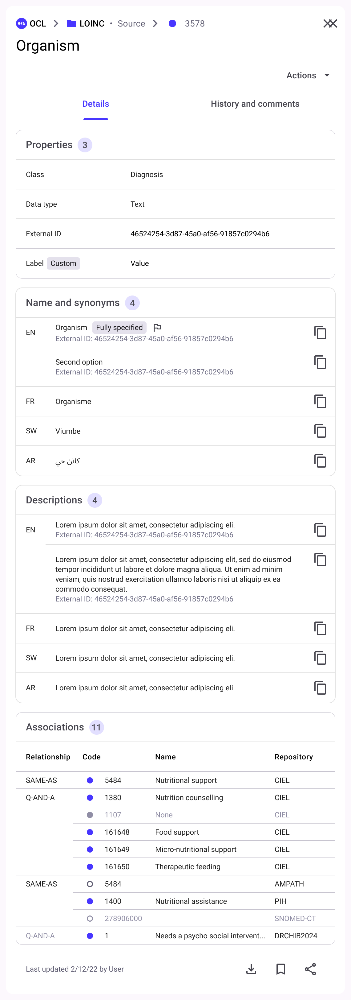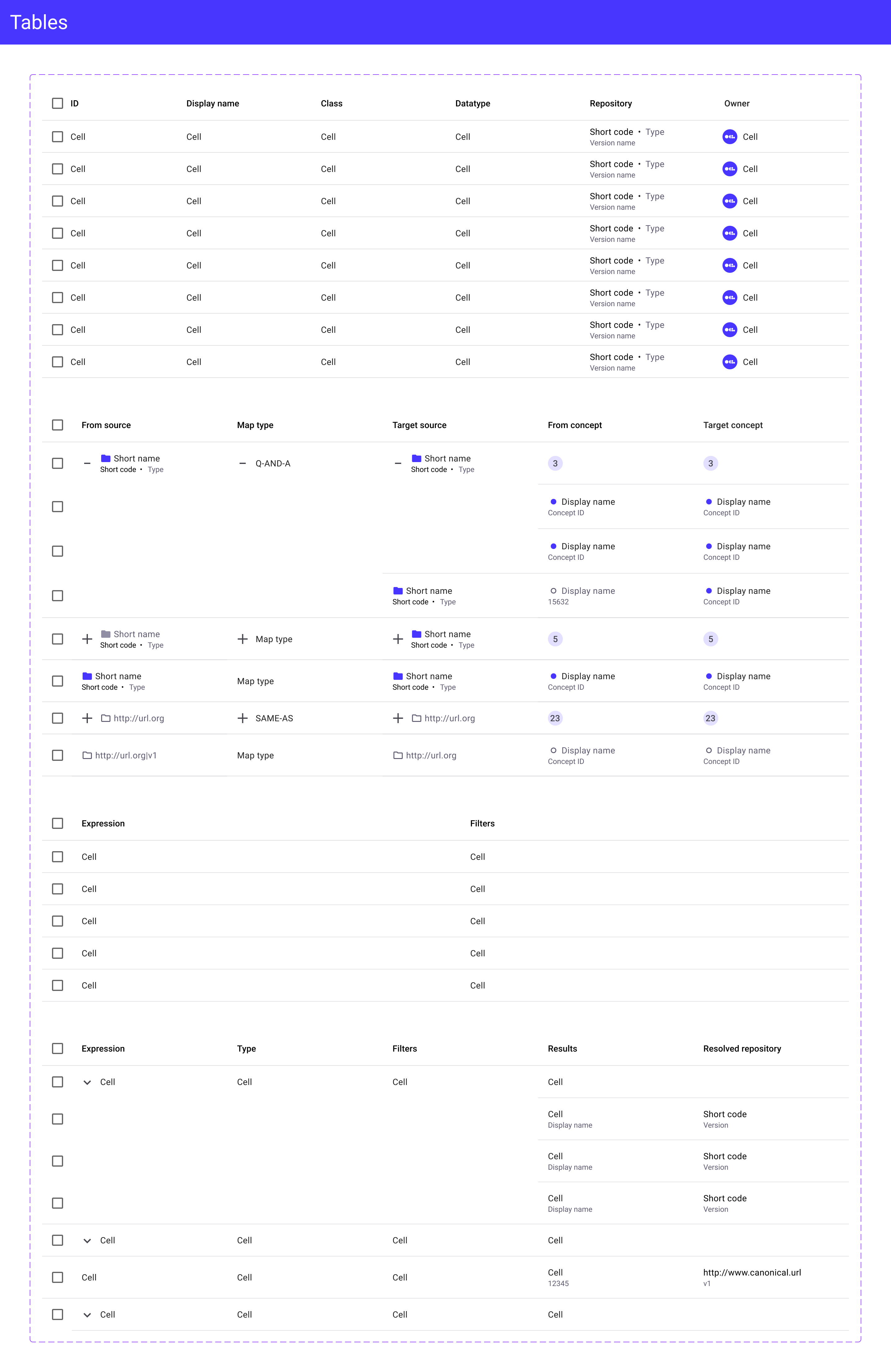 Card designs exist; tooltips and chips aren't implemented for concept/mapping/reference/expansion yet. Associations are present but not hierarchical.