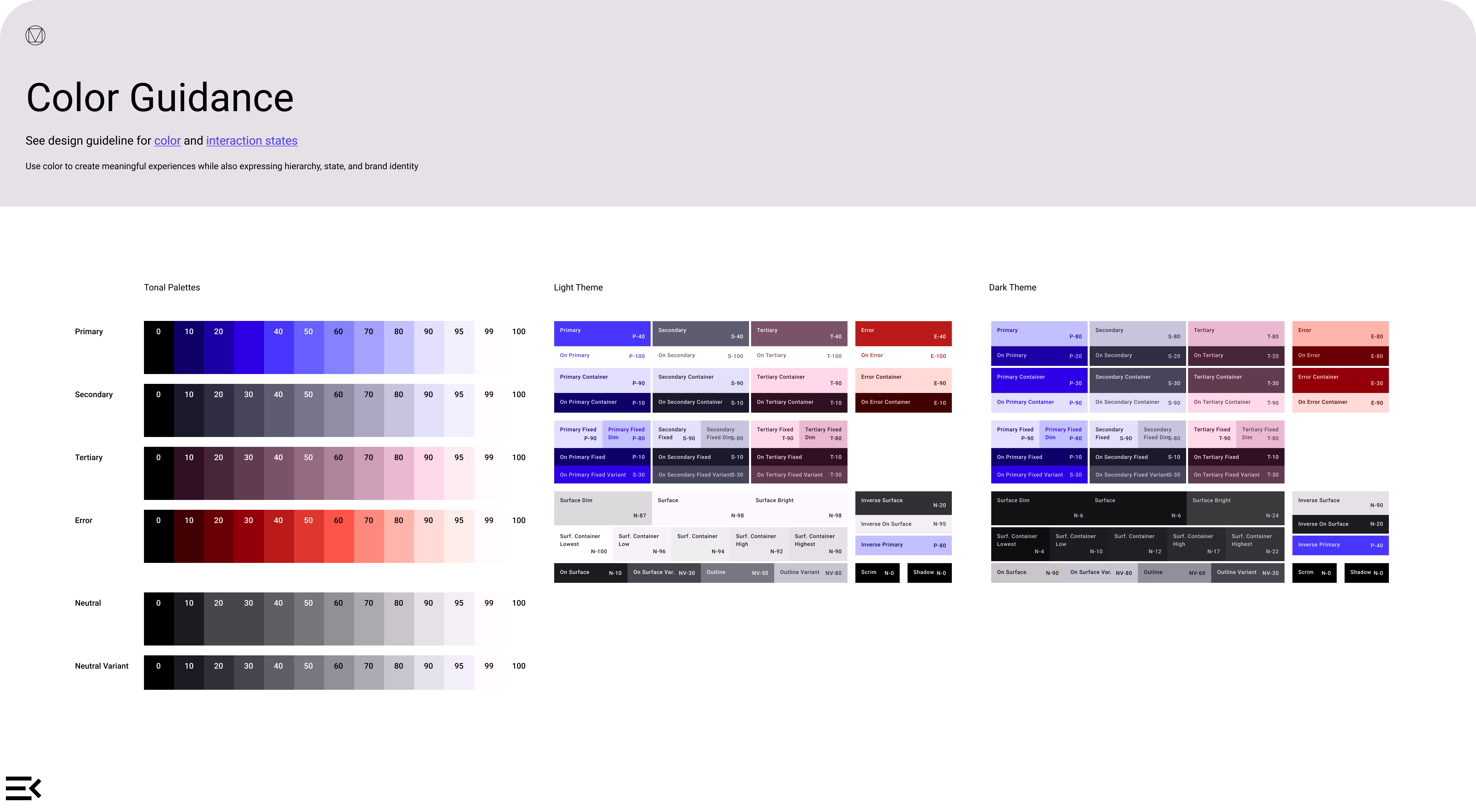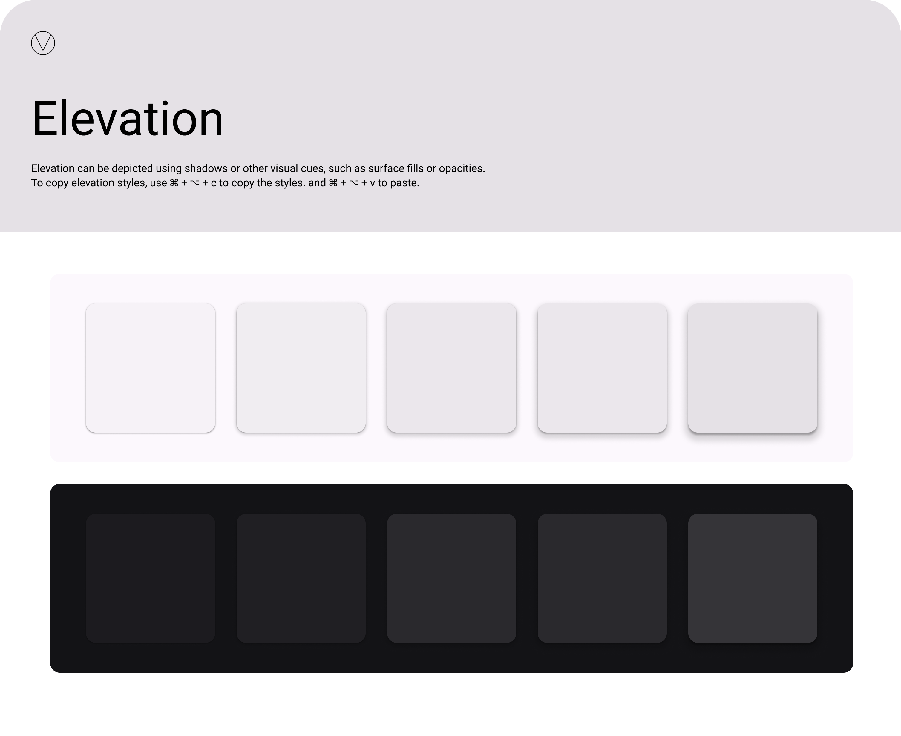 Color tokens are 100% implemented in code (referenced by name, e.g. primary.80). Only the first elevation level is used.