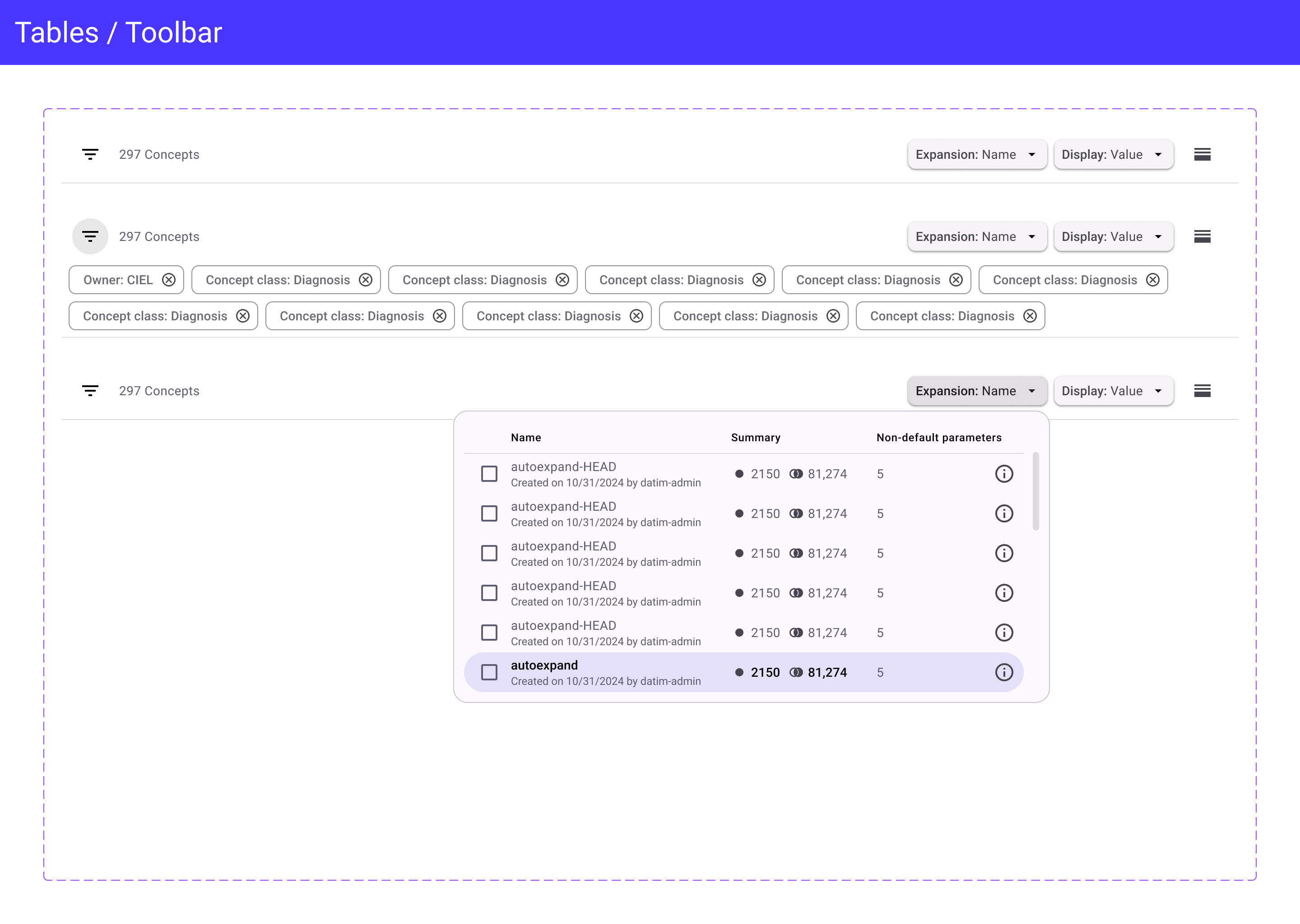 First search-concept table is done; remaining table/toolbar components are pending. Key-value-pair component is a known gap.